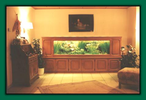 Das Becken hat eine Gesamtwassermenge von ca. 1000 Litern, bei 3m Gesamtlänge, 60cm Tiefe und 60cm Höhe. Das Becken steht auf einem speziellen Stahlgestell, das von einem versierten Möbelschreiner, passend zur sonstigen Wohnungseinrichtung, komplett mit Holz verkleidet wurde und im unteren Teil - mit Türen versehen - die zugehörige Aquarientechnik aufnimmt und als zusätzliche Ablage für Aquarienzubehör dient.