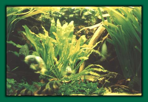 Ein Blick in den linken Teil des großen Aquariums mit seiner prägnanten Amazonas-Schwertpflanzen-Art, die als Deckung für die großen Augenfleckbuntbarsche und die Skalare dient.