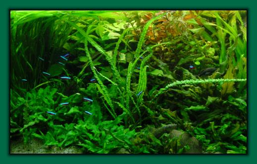 Ein Blick in den linken Teil des Stollenwand-Aquariums mit einer prächtigen langblättrigen Cryptocorynenart zwischen denen die Neonfische ihre Bahnen ziehen. Durch das von Vallisnerien von oben gedämpfte Licht kommt das Farbspiel dieser Fische erst richtig zur Geltung. Leider ist die Bildqualität (vor allem die Bildschärfe bei den Neonfischen) aufgrund der unzureichenden Lichtverhältnisse nicht berauschend.
