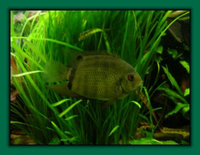 Hier ist einer der beiden Augenfleckbuntbarsche im großen Becken zu sehen. Die beiden Fische wurden als Jungtiere vor zwei Jahren angeschafft und sind zu imposanten Tieren herangewachsen. Es wurde auch bereits an einigen Riesen-Vallisnerien abgelaicht.