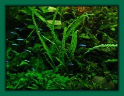 Hier noch einmal ein Blick in den linken Teil des Stollenwand-Aquariums mit seiner prächtigen langblättrigen Cryptocorynenart zwischen denen die Neonfische ihre Bahnen ziehen.