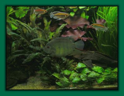 Hier sehen wir im großen Becken einen der Augenfleckbuntbarsche sowie links unter ihm einen der 42cm langen Wabenschilderwelse. Über dem Augenfleckbuntbarsch erkennt man einige der Blauen Kongosalmler ihre Kreise ziehen. Unter dem gedämpften Licht der Riesenvallisnerien zeigen diese Tiere eine phantastische Farbenvielfalt.