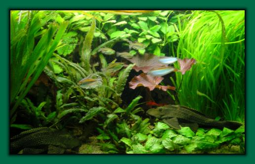 Hier sieht man beide Wabenschilderwelse des großen Beckens recht eng beieinander liegen. Das kommt selten vor, da sich beide Tiere sonst aus dem Weg gehen. Ein Tier beherrscht den linken Teil des Beckens und das andere Tier den rechten Teil.