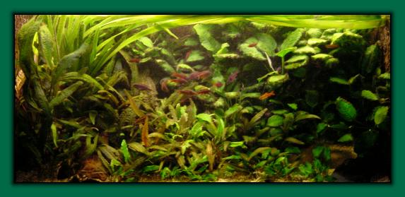 Hier eine Totalaufnahme des kleinen Beckens in der Küche. Wer genau hinschaut, sieht die kleinen teilweise tiefroten Bitterlings- und Eilandbarben.