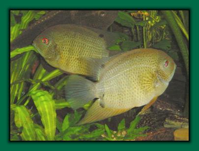 Die beiden Augenfleckbuntbarsche im dunklen Dickicht, im Hintergrund einer der Wabenschilderwelse. Es handelt sich um äußerst ruhige und aufgrund ihrer Körpergröße um imposante Tiere, die nicht wühlen und bei ausreichender Fütterung sich auch nicht an Pflanzen zu schaffen machen. Sie dominieren ganz klar neben den beiden Wabenschilderwelsen das große Becken. Da sie aufgrund ihrer Körpergröße nichts zu fürchten haben, stehen sie ähnlich Diskusfischen vollkommen ruhig unter Wurzeln und großen Pflanzen im Wasser. Es wurde schon mehrfach an den Riesenvallisnerien abgelaicht.